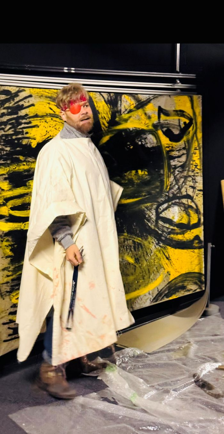 Ich male in einem eigens gebauten dunklen Raum. Ich kann nicht sehen, was ich male, aber ich male weiter, und diese Prämisse verbindet mich auf gewisse Weise mit der Erfahrung jenes Genies, das wir heute mit unseren künstlerischen Werken feiern. Um mich vorzustellen, schicke ich euch ein Foto von mir in der Dunkelkammer meines Ateliers.